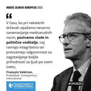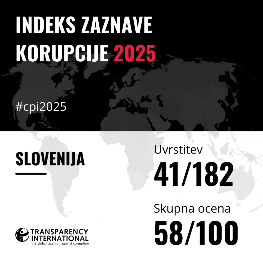 CPI 2025 potrjuje, da Slovenija ostaja del relativno stabilnenega evropskega okolja, a hkrati opozarja, da se brez doslednega uveljavljanja pravil, politične odgovornosti in transparentnosti zaznava korupcije dolgoročno ne izboljšuje, četudi v državi obstaja zakonodjani okvir, ki omogoča boj proti korupciji. Za uspešen boj so namreč potrebne močne neodvisne institucije, aktivna civilna družba ter politična voljo, ki je dosledno zavezana integriteti v praksi, ne le v besedah. CPI 2025 rezultati niso sodba o posamezni vladi ali politični opciji, temveč so pokazatelj zaupanja v delovanje institucij. (več)