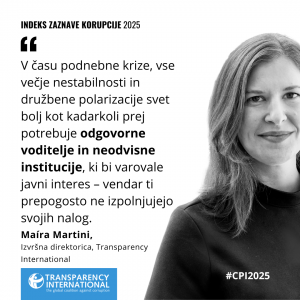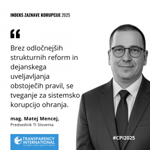 »Rezultati Indeksa zaznave korupcije (CPI) ne odražajo le posameznih afer, temveč predvsem delovanje institucij, kakovost nadzornih mehanizmov ter politično voljo za zagotavljanje transparentnosti, odgovornosti in vladavine prava. Posebej zaskrbljujoči so trendi na področju politične integritete, javnih naročil, kadrovskih postopkov, pomanjkanja učinkovitega pregona gospodarskega kriminala ter krhanja namesto krepitve neodvisnih institucij. Dolgoročno izboljšanje je mogoče le z močnimi neodvisnimi institucijami, svobodnimi mediji, aktivno civilno družbo ter jasno politično voljo, ki se dosledno kaže tudi v praksi. «