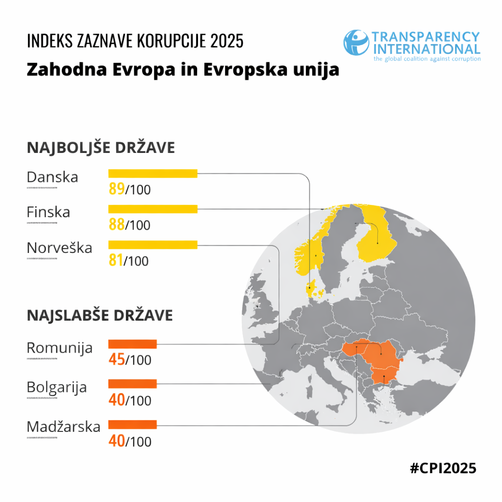 Slovenija tako po Indeksu zaznave korupcije po najnovejših podatkih zaostaja za povprečjem zahodnoevropskih držav, ki dosegajo v povprečju 64 točk, pred nami so z boljšimi rezultati tako Češka, Latvija in Litva. Indeks zaznave korupcije (CPI) se meri v 182 državah sveta, najvišji indeks na svetu je dosegla Danska in sicer 89, sledita ji Finska (88) in Singapore (84), najnižjega z 9 točkami pa sta dosegli Južni Sudan in Somalija. Med EU državami sta zadnji Bolgarija in Madžarska, ki sta dosegli le 40 točk. Več